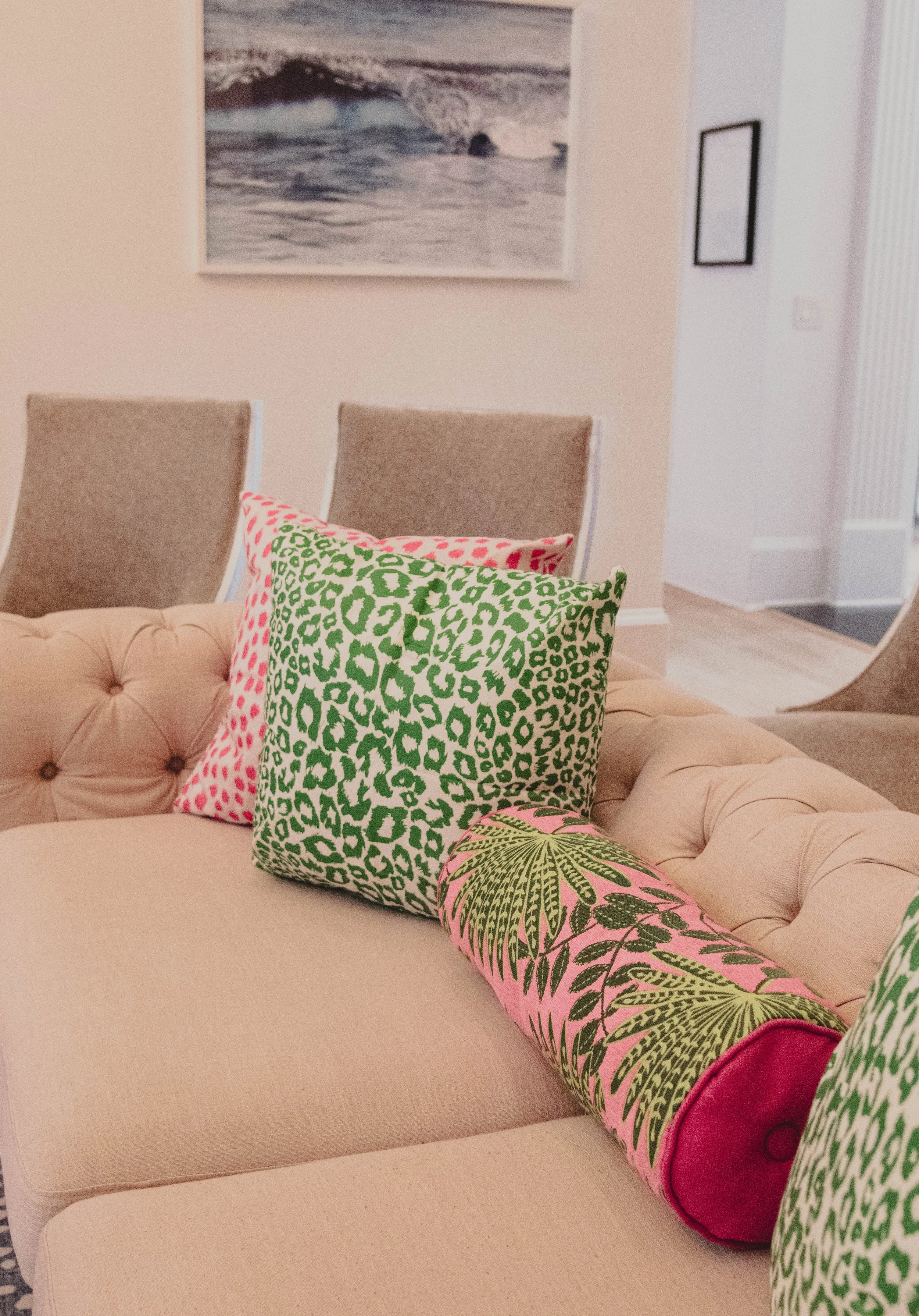 Create conversation corners with rattan chairs, velvet ottomans, or even vintage chaise lounges. Add accent pillows in shades of blush, coral, and leafy green.